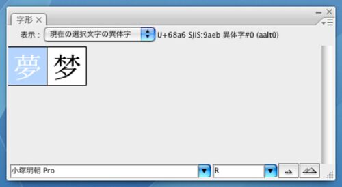 Adobe Illustrator(CS2およびCS3で確認)の字形パレットで「表示:現在の選択文字の異体字」としたとき、表示される情報が不吉だ。 「夢」という字を入力して選択し、字形パレットで情報を見ると「U+68a6 SJIS:9aeb 異体字#0(aalt0)」と表示されている。…