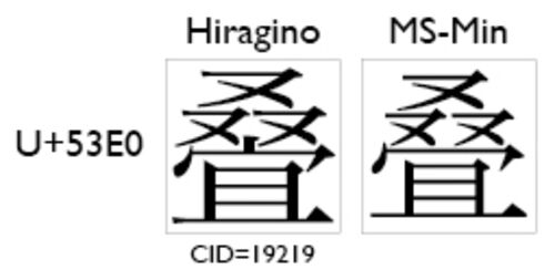 前回のエントリでUnicodeがウカンムリとワカンムリを包摂している例について調べていて気付いたのだが、U+53E0の実装は、けっこう妙な運命を辿っている。まず、U+53E0をヒラギノ明朝とMS明朝で表示してみると、下図のようにウカンムリ/ワカンムリの違いがあ…
