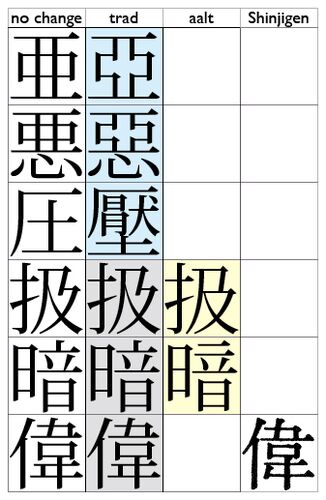 常用漢字のうち部分字体「八」を含む文字をリストアップし、'jp83'(または'jp78')タグを適用すると、小塚明朝やヒラギノはヒゲの付いた形になる。一方リュウミンの場合、部分字体「八」はもともとヒゲ付きで設計されているため、原則として'jp83'タグによ…