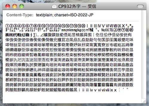前回のエントリのコメント欄でご指摘いただいたように、Snow LeopardのMailは、charset=ISO-2022-JPで送られてくるWindows外字を表示するようになった(下図)。 下図は、Panther(Mac OS X 10.3)、Tiger(10.4)、Leopard(10.5)、Snow Leopard(10.6)の…