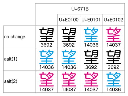 前回述べたように、IVSはGSUBよりも新しい分、すっきりと論理的にできている。だから、「漢字の異体字指定に関してはGSUBからIVSに乗り換える」というような思い切った転換を行い、なおかつInDesignなどにおけるIVSの扱いが信頼できるものであるなら、みんな…