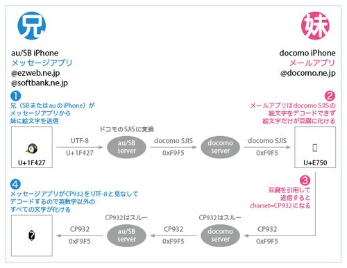 iPhone間の新しい文字化けパターンが発見されたのでメモ*1。この少なくとも3つのダメな仕様が重なって発生する文字化けは、発見者によって「兄化け」と命名された*2。 「兄化け」は、兄がSoftBankまたはauのiPhoneでメッセージアプリを、妹がiPhoneのメール…