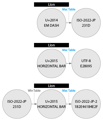 - 下図は、LionのMailにおけるダッシュの扱いをまとめたもの。「表示はWinテーブル、送信はMacテーブル」という仕様は、Snow LeopardのMailと変わっていない。U+2014 EM DASHを含む新規メッセージはcharset=ISO-2022-JPで、U+2015 HORIZONTAL BARを含む新規メッセージはcharset=UTF-8で送信される。ここまでは、Snow LeopardのMailと同じ。ただし「ISO-2022-JP(またはISO-2022-JP-2)のメールへの返信」にU+2015 HORIZONTAL BAR(Windows式のマッピングの文字)が含まれていた場合、UTF-8ではなくISO-2022-JP-2で送信される。